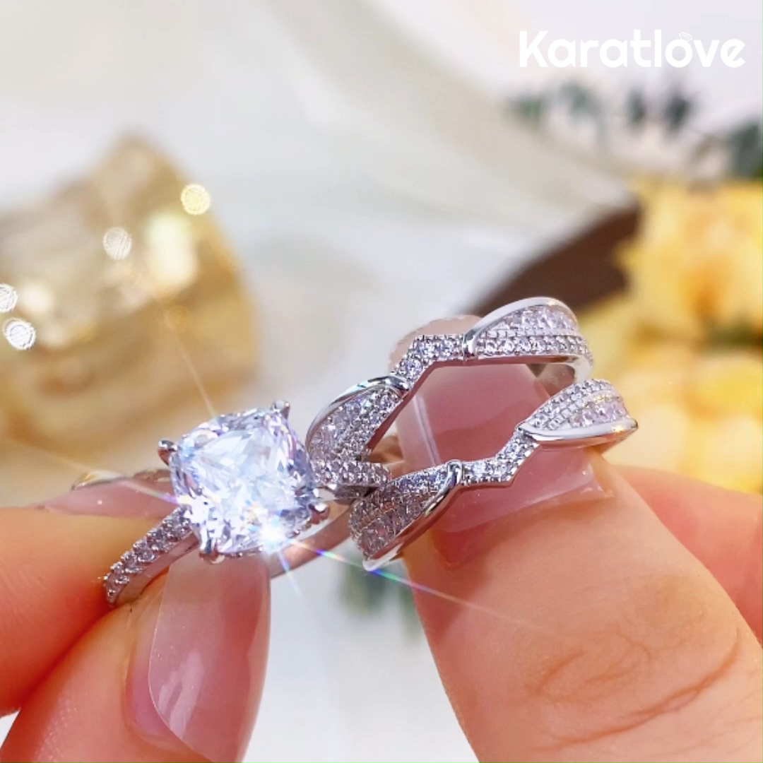 Cushion Cut Diamond White Insert Sterling Silver Hidden Halo Jacket Bridal Sets