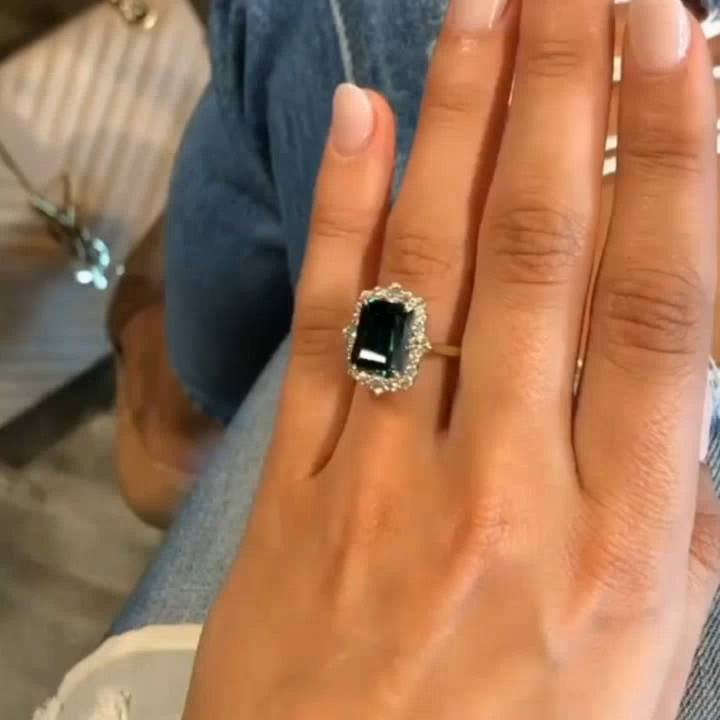 Emerald Cut Emerald Green Yellow Gold Halo Engagement Ring in 925 Sterling Silver