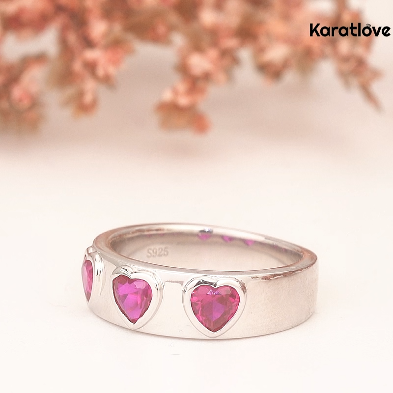 Three Heart Cut Ruby Red Sterling Silver Bezel Promise Ring