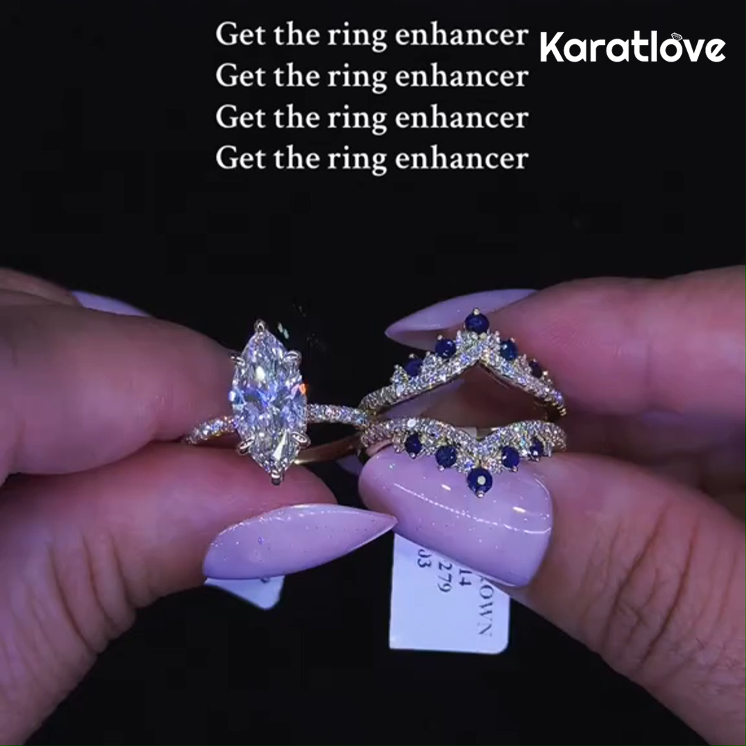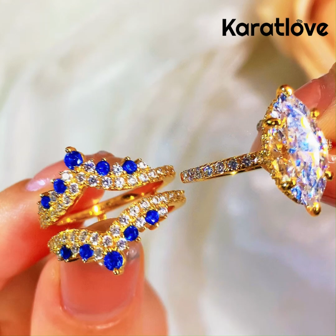 Marquise Cut Diamond White Sapphire Blue Yellow Gold Sterling Silver Insert Wedding Ring Set
