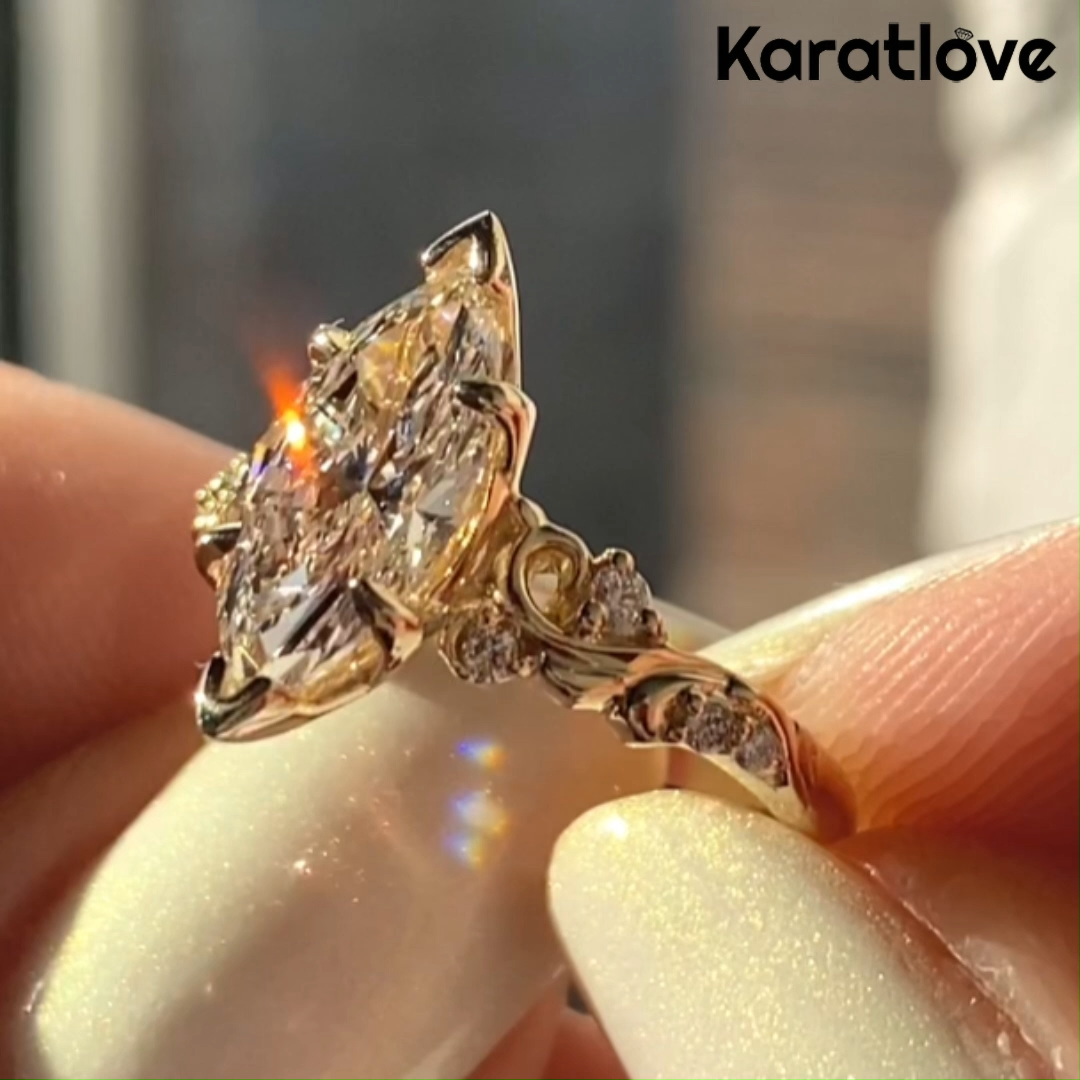 This vintage-inspired ring centers a brilliant marquise-cut stone in a secure prong setting. Crafted from warm yellow gold, it features intricate Art Deco scrollwork and delicate pavé diamond accents along the band, creating a romantic, heirloom aesthetic.