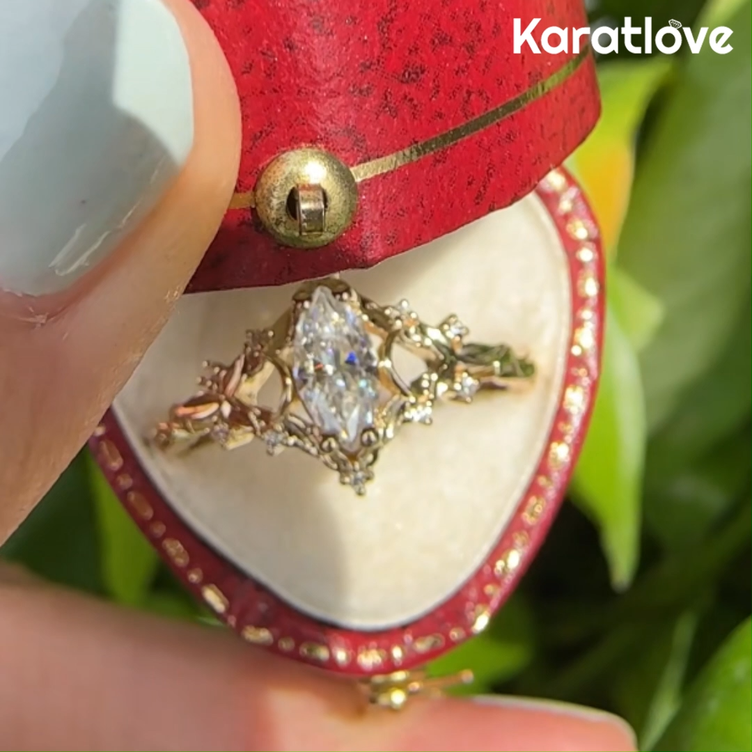 This ring features a brilliant marquise-cut center stone set in an ornate Art Deco-inspired frame with intricate openwork. Crafted from yellow gold plated sterling silver and accented with tiny pavé stones, it delivers timeless vintage glamour.