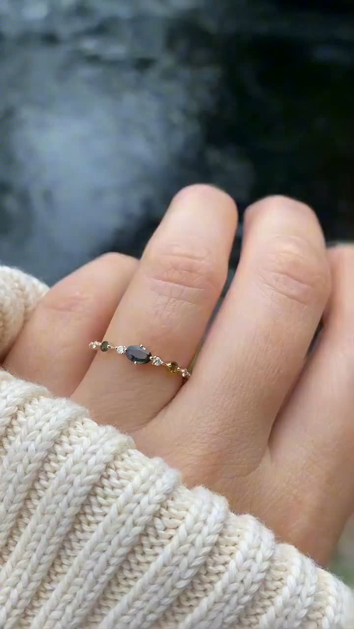 This delicate engagement ring features a captivating oval-cut emerald green center stone, flanked by alternating small accent stones in complementary green and clear hues. Crafted from sterling silver with a warm yellow gold finish, the slender band showcases these stones in a dainty, linear arrangement. The design’s understated elegance and natural color palette create a fresh, modern look, making it a perfect choice for those who appreciate a unique, nature-inspired take on classic engagement ring styles.