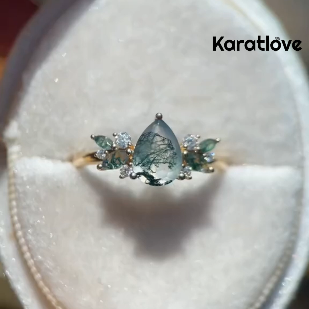 Pear Cut Green Moss Agate Nature Inspired Sterling Yellow Gold Engagement Ring