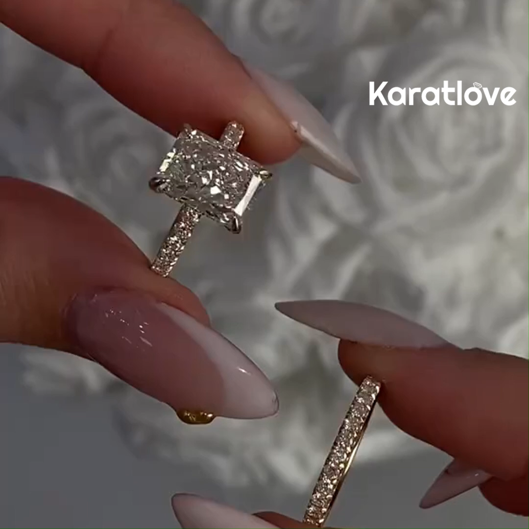 Radiant Cut Diamond White 925 Sterling Silver Yellow Gold Hidden Halo Wedding Ring Set