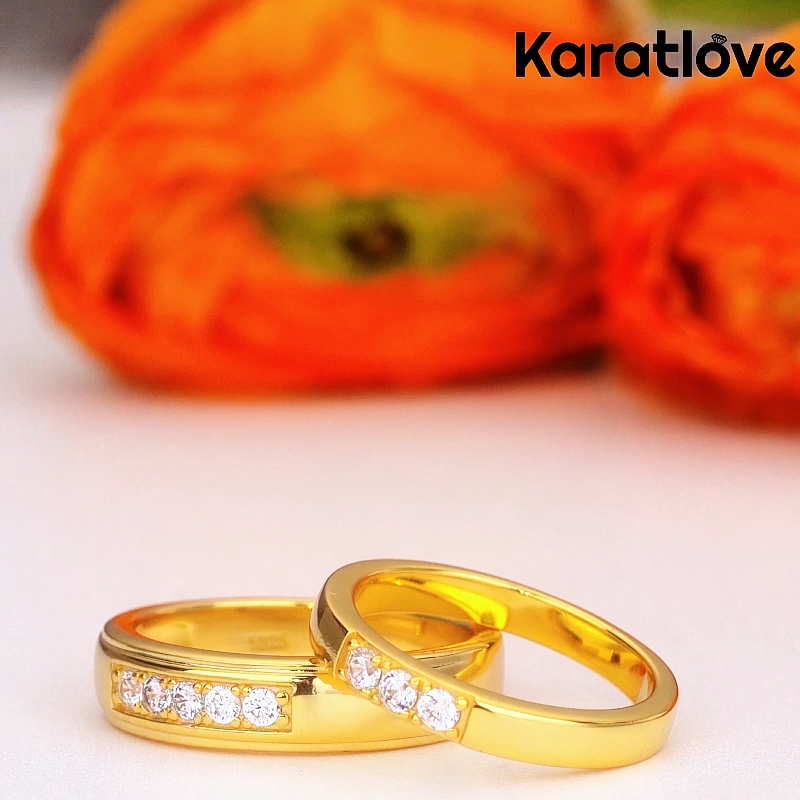 This elegant couple’s wedding set features a continuous row of brilliant round-cut diamond simulants, set in polished 925 sterling silver with a luxurious yellow gold finish. The matching design symbolizes unity and everlasting love, with a refined, modern aesthetic that’s perfect for everyday wear or special occasions.