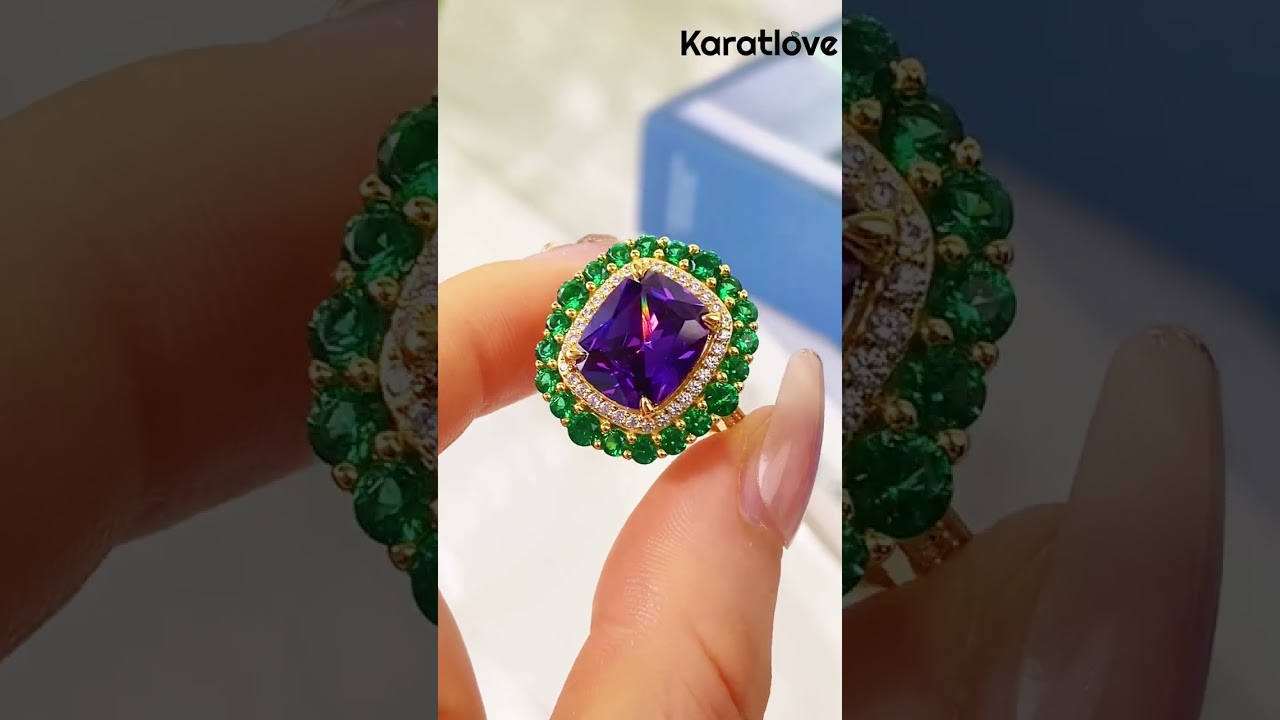 Cushion Cut Amethyst Sterling Silver Yellow Gold Double Halo Engagement Ring