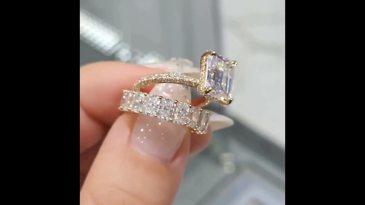 Emerald Cut Diamond White Yellow Gold Classic Ring Sets in 925 Sterling Silver