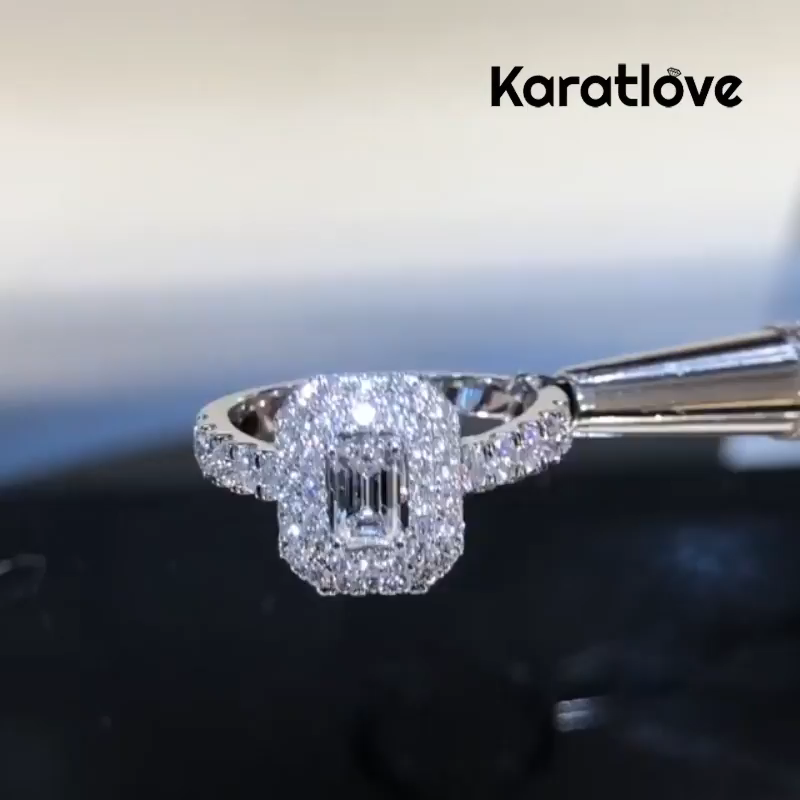 Anillo de compromiso de diamante corte esmeralda blanco en plata esterlina 925 con doble halo