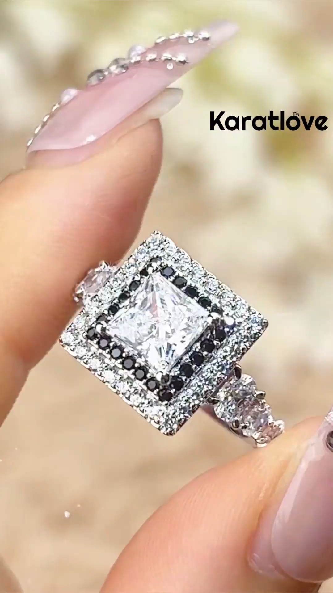 Anillo de compromiso de plata esterlina con doble halo de piedras preciosas blancas y negras con diamante corte princesa