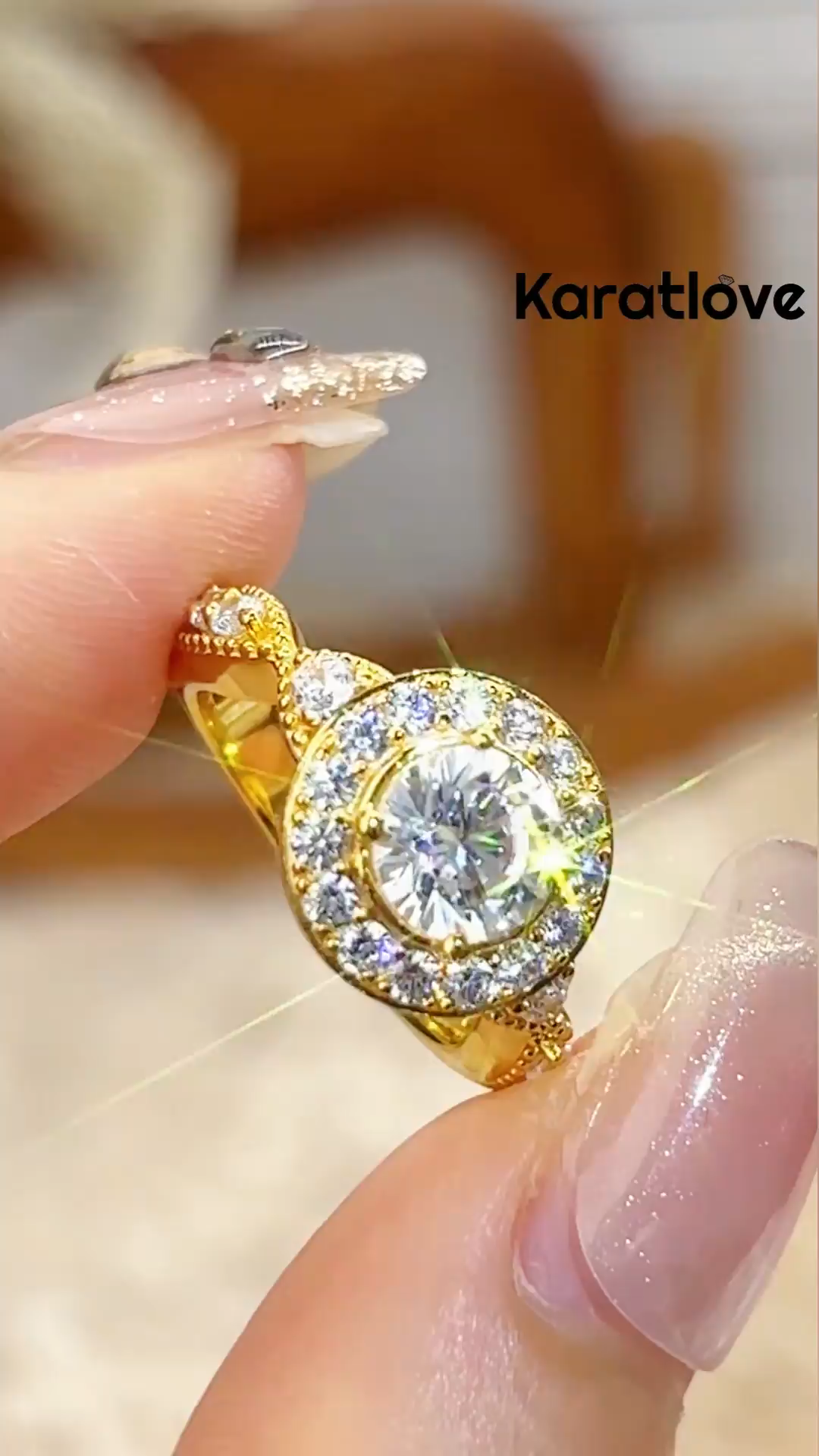 Anillo de compromiso vintage de oro amarillo con diamante de corte redondo y halo retorcido de plata esterlina blanca