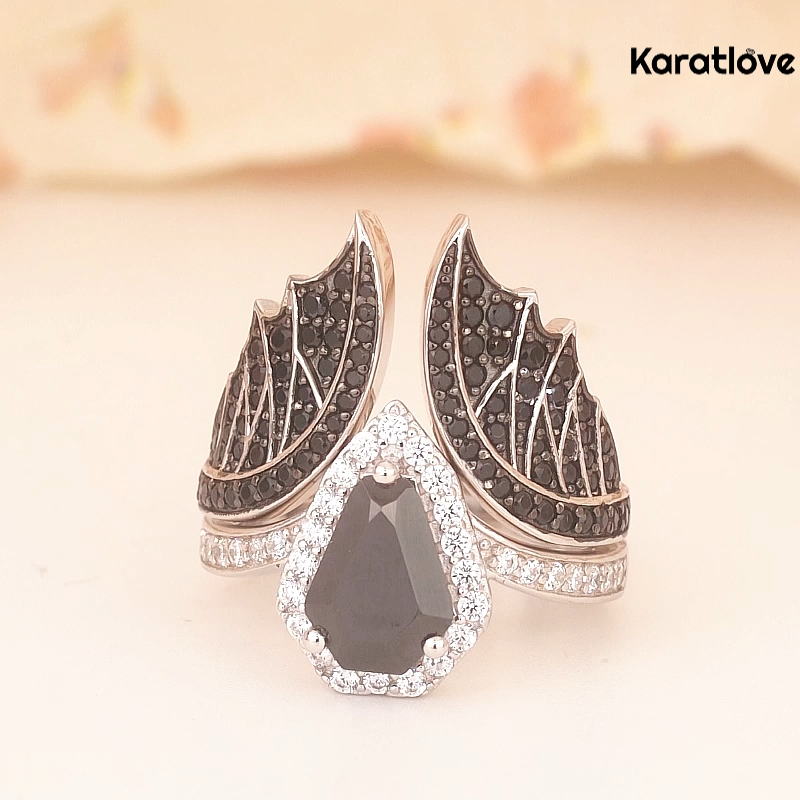 This bold bridal set, crafted from 925 sterling silver, embodies the dramatic allure of Gothic design. At the heart of the engagement ring, a striking coffin-shaped fancy black stone is encircled by a luminous halo of white diamonds, creating a stark, eye-catching contrast. Flanking the center stone, intricately detailed bat wings, paved with black and white diamonds, spread outward, adding a sense of dark romance and mystery. The matching wedding band mirrors this design, seamlessly stacking to enhance the set’s dramatic impact. This collection is a distinctive choice for the modern bride who embraces unique, edgy symbolism and timeless craftsmanship.
