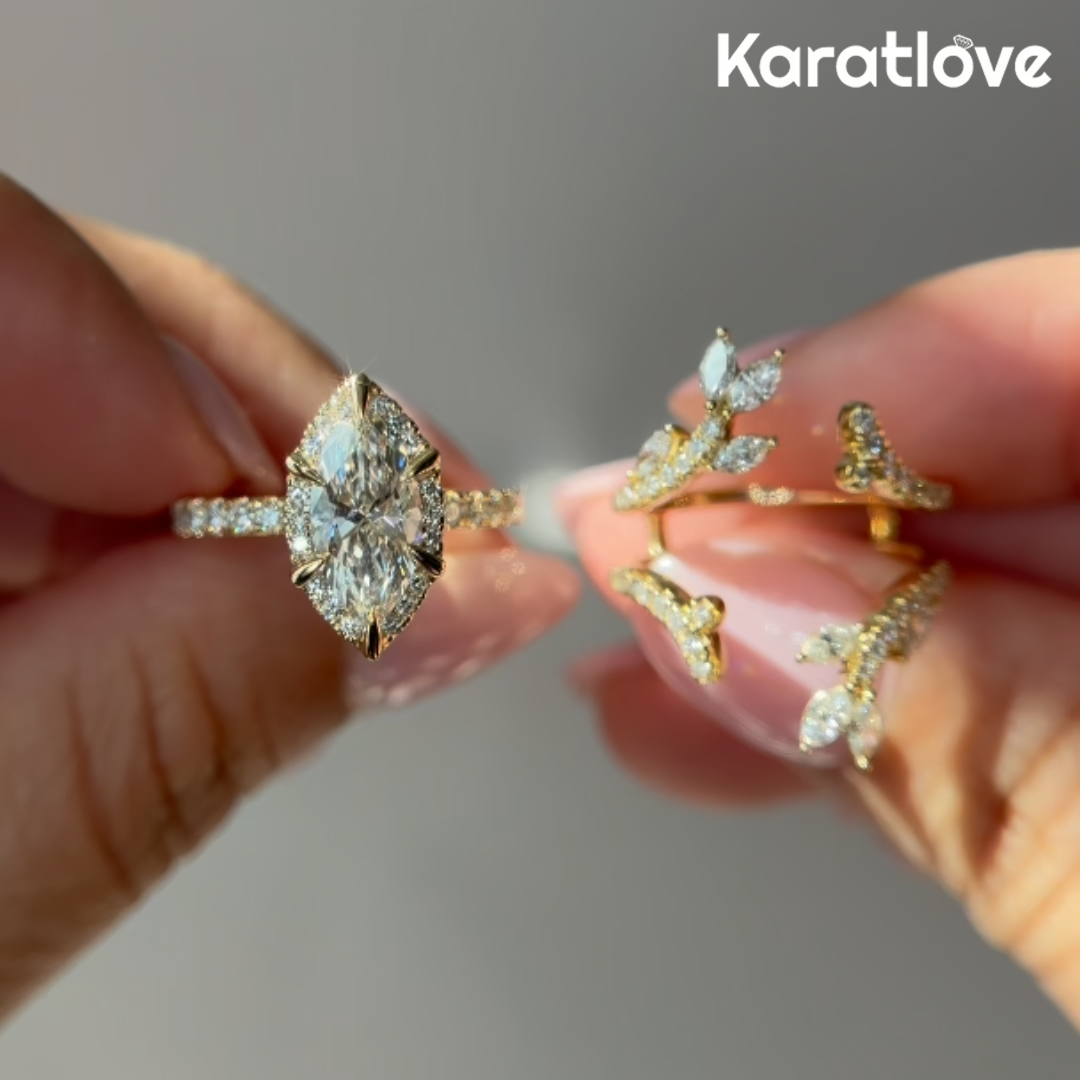 This elegant bridal set features a marquise-cut diamond center stone framed by a delicate halo of pavé diamonds. Crafted from yellow gold plated sterling silver, the matching insert enhancer ring showcases nature-inspired marquise and leaf-shaped pavé accents, creating a layered, romantic silhouette with exceptional sparkle.