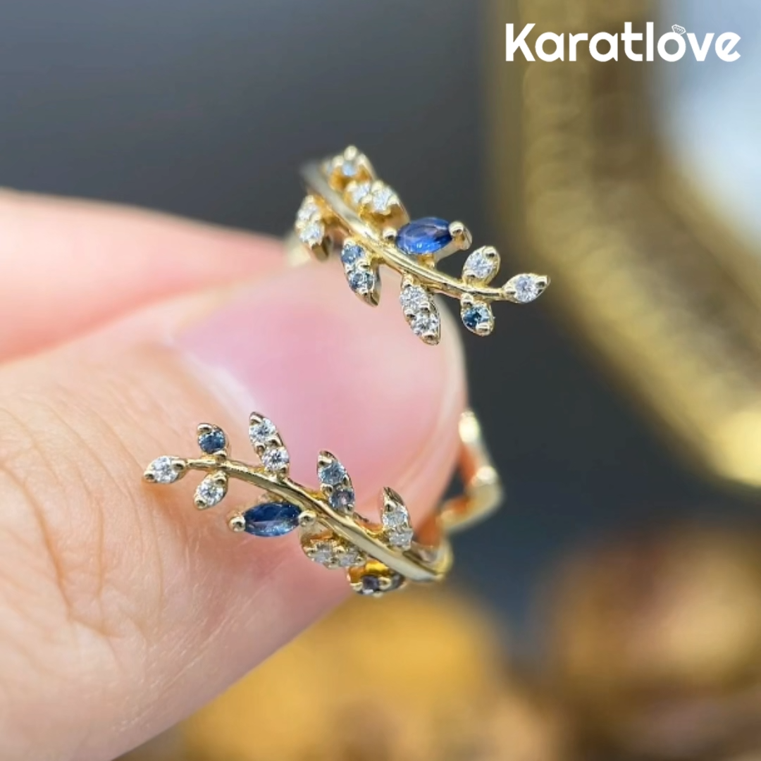 This enchanting bridal set features a brilliant oval-cut diamond center stone, embraced by an intricate yellow gold plated sterling silver band designed like intertwining leaf branches. Adorned with vibrant blue gemstone accents and delicate pavé details, the nature-inspired silhouette creates a romantic, organic masterpiece perfect for the modern bride.