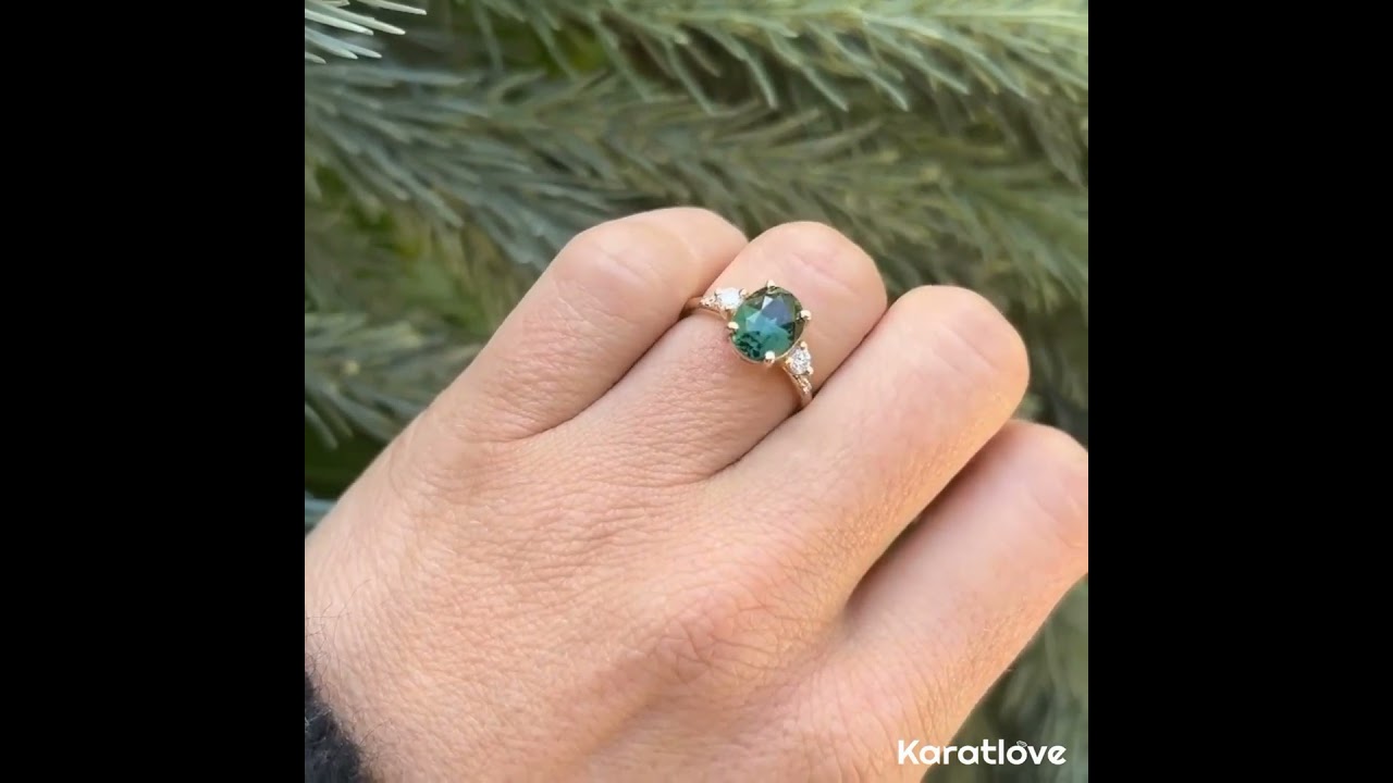 Oval Cut Emerald Green 925 Sterling Silver Yellow Gold 3-Stone Engagement Ring