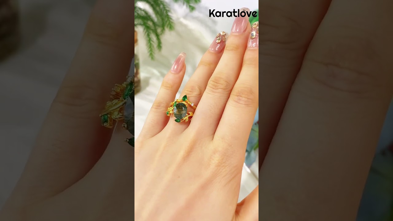 Oval Cut Green Moss Agate Nature Inspired Sterling Silver Yellow Gold Bridal Ring Set