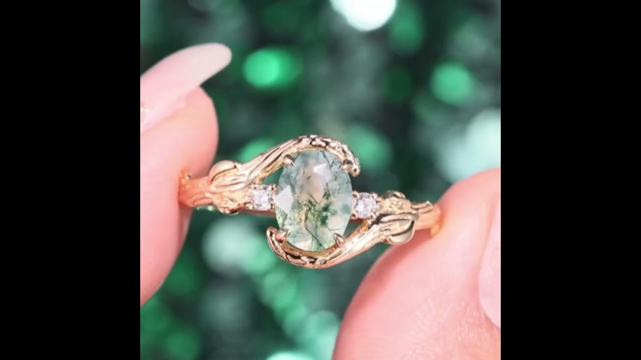 Oval Cut Green Moss Agate Nature Inspired Sterling Yellow Gold Engagement Ring