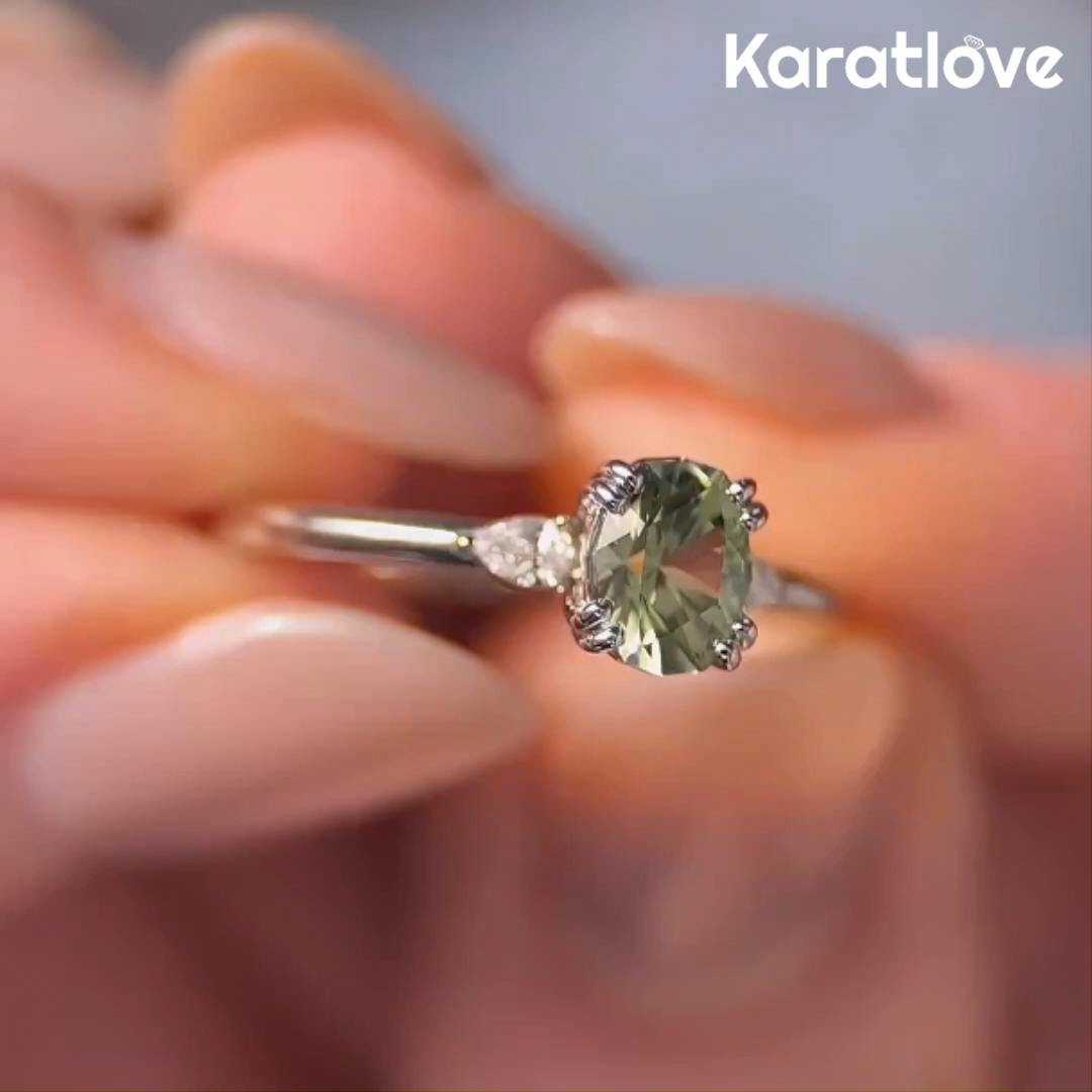 This delicate 3-stone ring centers a luminous oval-cut green peridot, held in a secure prong setting to highlight its natural olive hue. Crafted from polished sterling silver, the band is accented with two pear-cut pavé stones on the shoulders, creating a refined, vintage-inspired silhouette with soft green sparkle.