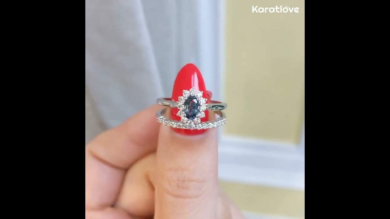 Oval Cut Sapphire Blue 925 Sterling Silver Halo Ring Set