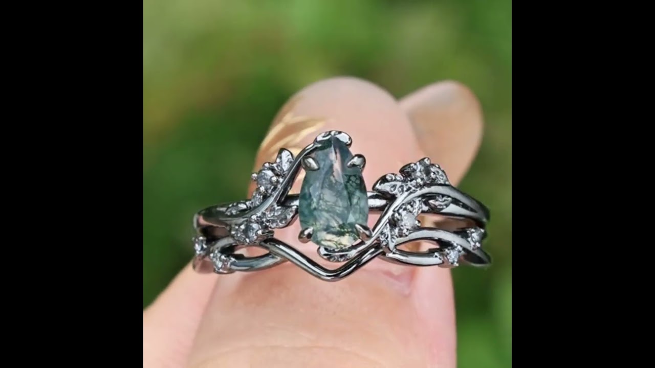 Pear Cut Green Moss Agate Nature Inspired Black Sterling Silver Engagement Ring