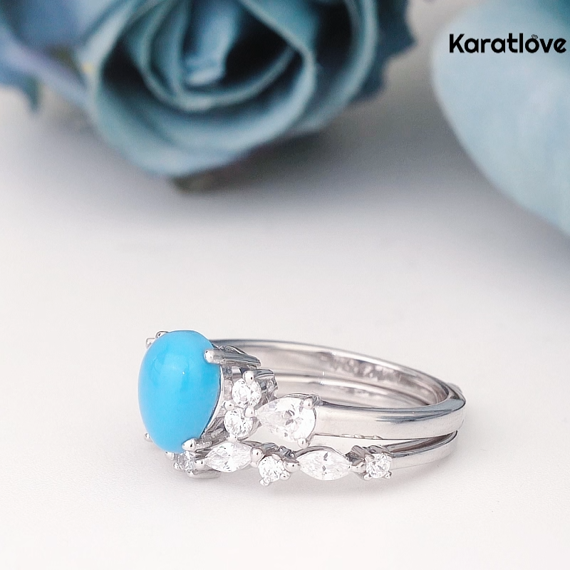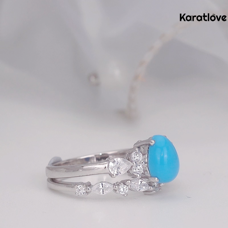 This striking bridal set, crafted from 925 sterling silver, captures the geometric elegance of the Art Deco era. At the center of the engagement ring, a luminous pear-cut turquoise-blue cabochon is framed by a symmetrical arrangement of sparkling round and pear-cut diamonds, creating a bold, eye-catching focal point. The matching wedding band mirrors this design, with a continuous line of diamonds that seamlessly stack with the engagement ring. The clean, angular metalwork and precise stone settings embody the sophistication of the Art Deco style, making this set a distinctive and timeless choice for the modern bride.