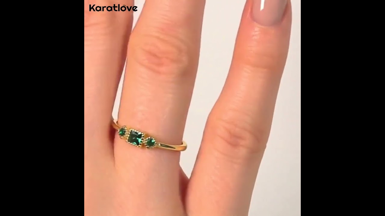 Princess Cut Emerald Green 925 Sterling Silver Yellow Gold 3-Stone Stackable Minimalist Engagement Ring