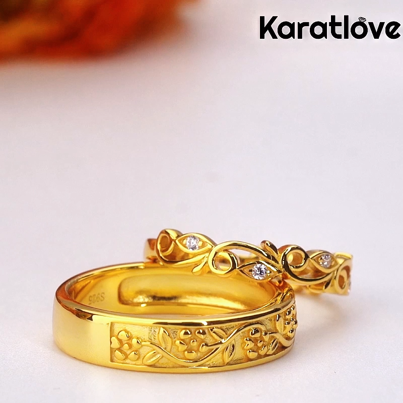Round Cut Diamond White 925 Sterling Silver Yellow Gold Floral Vine Couple Rings