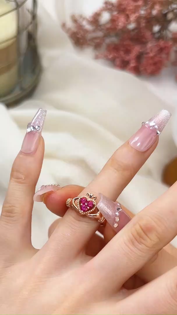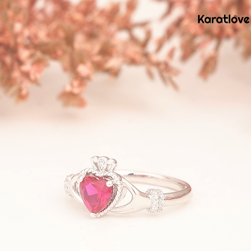 This romantic Claddagh ring blends timeless Irish symbolism with modern elegance, crafted from 925 sterling silver finished in warm rose gold. The iconic design features two hands cradling a heart, crowned at the top—representing friendship, love, and loyalty. The heart is set with three brilliant round-cut ruby-red stones, creating a vivid focal point. Delicate rope-textured detailing adorns the heart frame and the sides of the band, adding vintage-inspired charm. The smooth, polished band ensures a comfortable fit, making it a meaningful choice for engagements, weddings, or as a heartfelt gift.